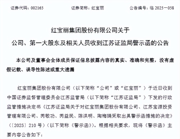 12月12日,红宝丽集团股份有限公司(002165.SZ,以下简称“红宝丽”)发布公告称,红宝丽、控股股东江苏宝源投资管理有限公司及董事长芮敬功等4名高管收到江苏证监局警示函,涉及关联方非经营性资金占用未披露、年报信息披露不准确等违规行为,相关违规情况已被记入证券期货市场诚信档案。同日,深交所对红宝丽及相关当事人同步给予通报批评处分。