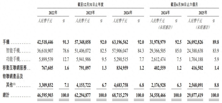 按照产品类型划分,传音控股拥有手机、移动互联网服务、物联网产品及其他三大业务。其中,手机业务又可进一步细分为智能手机和功能手机。2022年至2024年及2025年上半年,手机业务收入分别为425.18亿元、573.48亿元、631.97亿元和260.93亿元,占营收的比例分别为91.3%、92.0%、92.0%和89.8%,反映出传音控股对于单一业务的依赖程度显著偏高。